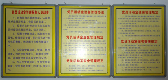 贵州省地矿局103地质大队党员活动室于2005年10月建成,并经省地矿局验收通过。 党员活动室由活动室、图书阅览室、会议室三位一体构成,总面积200余平方米,可供130多人同时开展活动。党员活动室配有34寸高清晰数字彩电、音像设备、饮水机、书柜、会议桌椅等,各项设施齐备。党旗、伟人像、党的宗旨等有关知识、名人励志格言均上墙,党员学习教育书籍、光碟、报刊杂志俱全。党员活动室各项管理制度健全,队党委并安排有专人对党员活动室进行管理。