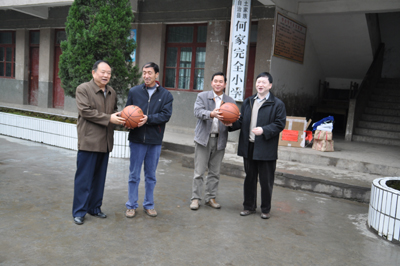 吴道生书记(右四)、况忠辉副书记(右三)向何家完小捐赠羽毛球等体育器材 吴道生书记(左一)、况忠辉副书记(右一)向何家完小捐赠篮球