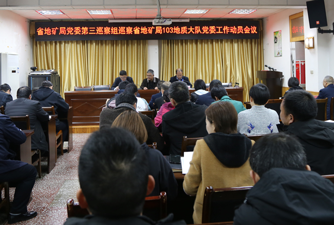 根据省地矿局党委关于巡察工作的统一部署,2021年4月12日下午,局党委第三巡察组巡察103队工作动员会召开。会前,局党委第三巡察组组长方显祥主持召开与103队党委书记舒多友、队长沈大兴的见面沟通会,传达了局党委书记付贵林在巡察工作动员会上讲话精神,并通报巡察任务和工作安排。动员会上,方显祥同志就即将开展的巡察工作作了动员讲话,103队党委书记舒多友主持会议并就配合做好巡察工作作了表态发言。