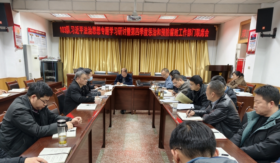 12月22日,103队召开习近平法治思想专题学习研讨暨第四季度惩治和预防腐败工作部门联席会,队党委班子成员,党支部(总支)书记及支委,队属二级单位班子成员,机关全体人员四十余人参会。